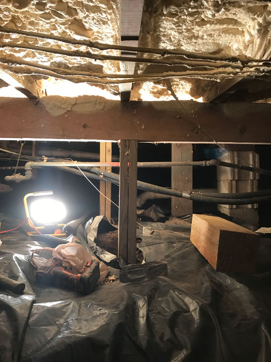 This project focuses on crawlspace repair, vapor barrier installation, and foundation work. It includes images of crawlspace with insulation, pipes, and construction materials, crawlspace with wooden supports and vapor barrier, and crawlspace with vapor barrier and concrete block support.