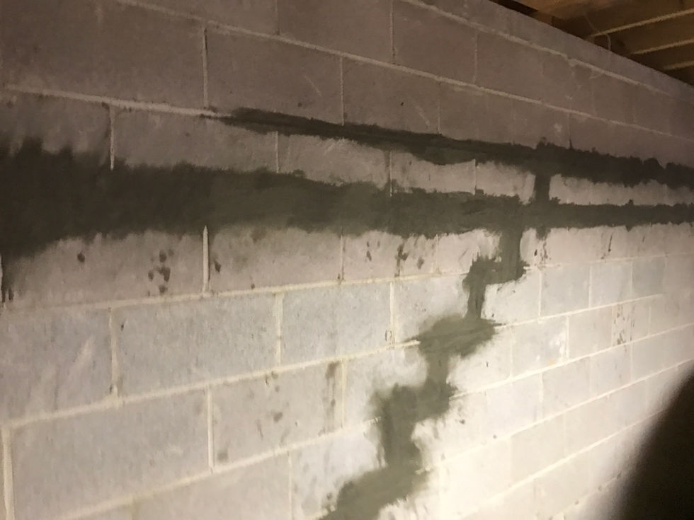 This project showcases the process of foundation repair and waterproofing. It includes images of concrete foundation wall with surrounding soil and trees, concrete wall with visible waterproofing repairs applied, and concrete foundation with black waterproofing applied.